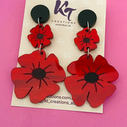 Custom made swirly marble red acrylic Poppy dangles. These have been hand painted to bring out the features. In honour of ANZAC Day- lest we forget. 15mm stud topper, and 60mm dangle. Stud backing made from surgical steel, which are perfect for sensitive ears. Acrylic earrings are lightweight to wear and the perfect accessory to every outfit.
