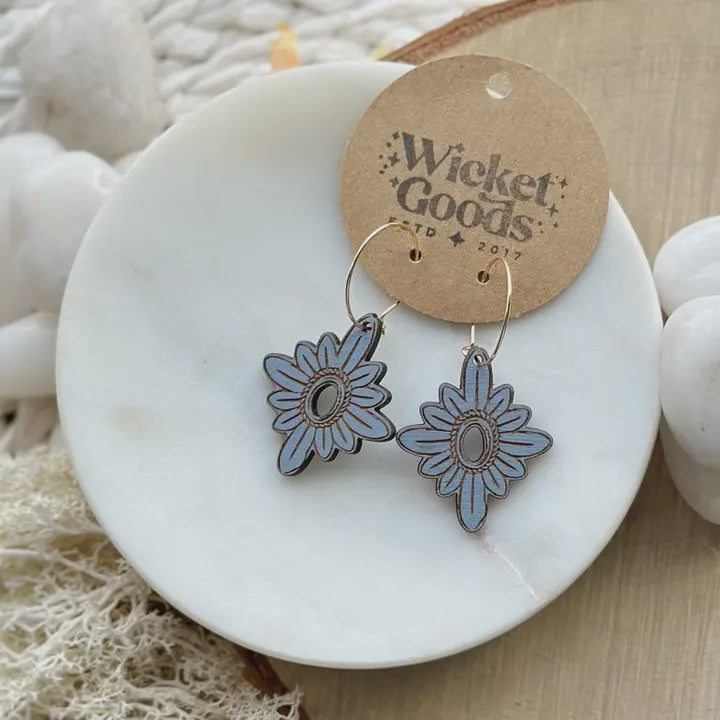 Made from hand painted and engraved baltic birch wood and hypoallergenic gold plated brass ear hoops. Designed and assembled in our home studio in Selah, Washington. Please note: Leather is unique and cut from different areas on each hide which will result in subtle variances in texture or print from piece to piece.