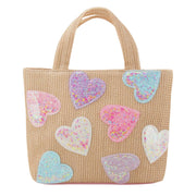 Did someone say summer staple? This trendy straw mini tote is the perfect go-to for any and every warm weather activity! Detailed with colorful confetti heart patches and a matching straw handle, it's perfect for lounging at the beach- or by the pool!