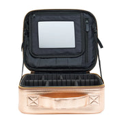 There is a mirror that can be balanced onto the edge of the bag for easy use, as well as a special brush compartment for storing delicate makeup brushes so they don’t get damaged.