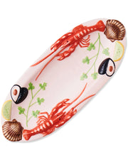 Serve up sweet nostalgia with our Lobster Bisque Oval Platter.Sides, salads and seasonal treats present beautifully on this platter featuring lobsters, shells, mussels and lemon wedges with a side of garnish in hand painted detail on white ceramic. Continue old traditions with this vintage inspired platter, reminiscent of a staple ceramic from many celebrations and family meal times of seasons past.