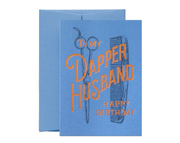 This birthday card sends birthday wishes to one dapper husband. It's been printed onto an embossed Colorplan New Blue stock, with a copper foil.
