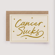 There's no other way of saying it... This card was designed to offer support, encouragement, love or just let someone know you're there for them. Illustrated "Cancer Sucks" support card, with gold hand-lettered design on a beige background surrounded by tiny hearts and a simple border. Blank inside for a personal message
