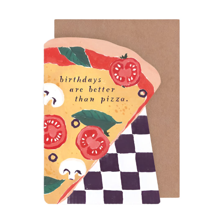 Send a slice of birthday fun with this pizza birthday card, perfect for the cheese lover! This unique pizza shaped greeting card is illustrated with toppings of tomato, mushroom and the caption “birthdays are better than pizza”.