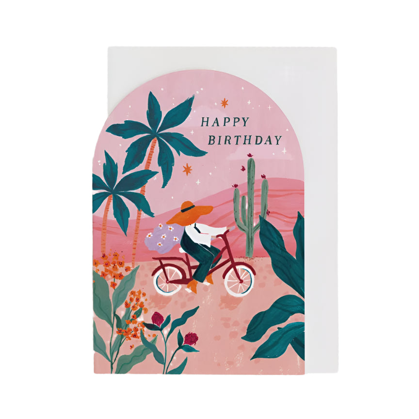 Celebrate an adventurous spirit with this beautifully illustrated birthday card. The luxury birthday card is cut into a unique arch shape and the hand painted artwork depicts a bike being ridden by a girl with flowers in her hair surrounded by blooming foliage, all in a desert-inspired colour palette. Perfect for cyclists, adventurers and those with a wanderlust vibe.