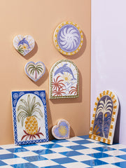 Introducing Soleil, Jones & Co's collection of capiz wall tiles that brings a touch of tropical paradise to your space. Immerse yourself in the warm hues and vibrant energy of original artwork featuring pineapples, palm trees, and dolphins, beautifully rendered in a palette of sun-kissed tones highlighted by shades of blue and lavender.