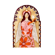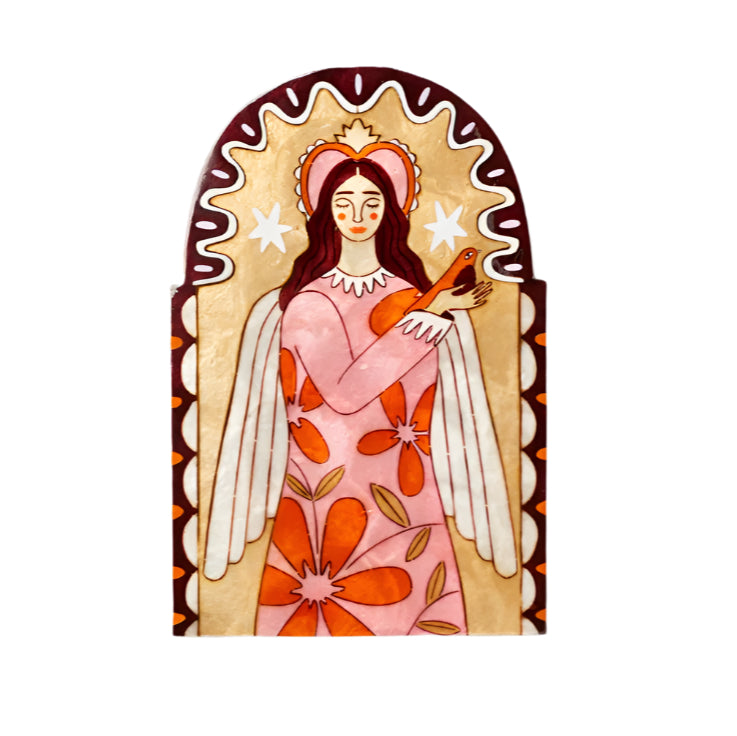 Add a touch of serenity to your space with this charming Gardienne Angel Pink arch wall art tile featuring a peaceful guardian angel holding a dove in a beautiful folk style. Hand-painted with care, it adds a sweet and calming touch to any room. Whether hung alone or as part of a collection, this wall art tile is sure to be a much-loved addition to your home and create a calm and serene vibe. We love this hung next to the bed or on the mantel piece with some candles.