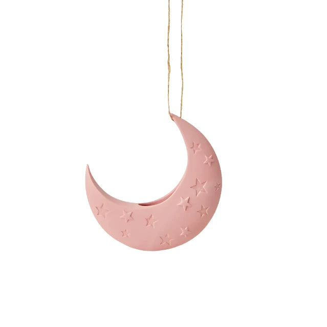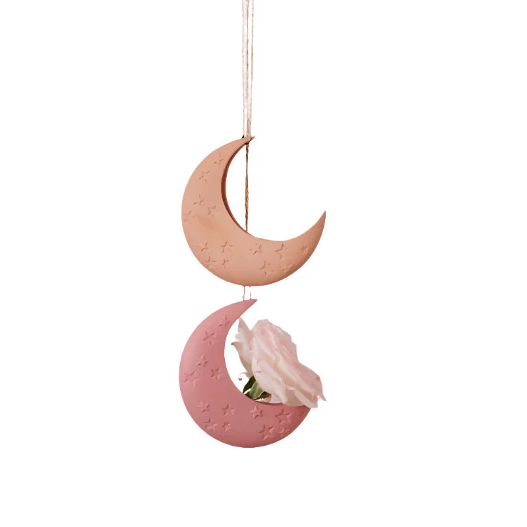 The stunning Luna Hanging Vase, a celestial-inspired piece that adds a bit of magic to any space. Crafted in a crescent moon shape, this vase features tiny stars embossed on its exterior, evoking a sense of wonder and enchantment. With just a simple string for hanging, it effortlessly suspends in the air, creating a captivating focal point wherever it is placed. Perfect for showcasing a single bloom, a delicate succulent, or an air plant, this versatile vase brings a touch of nature indoors while adding a dash of celestial charm.