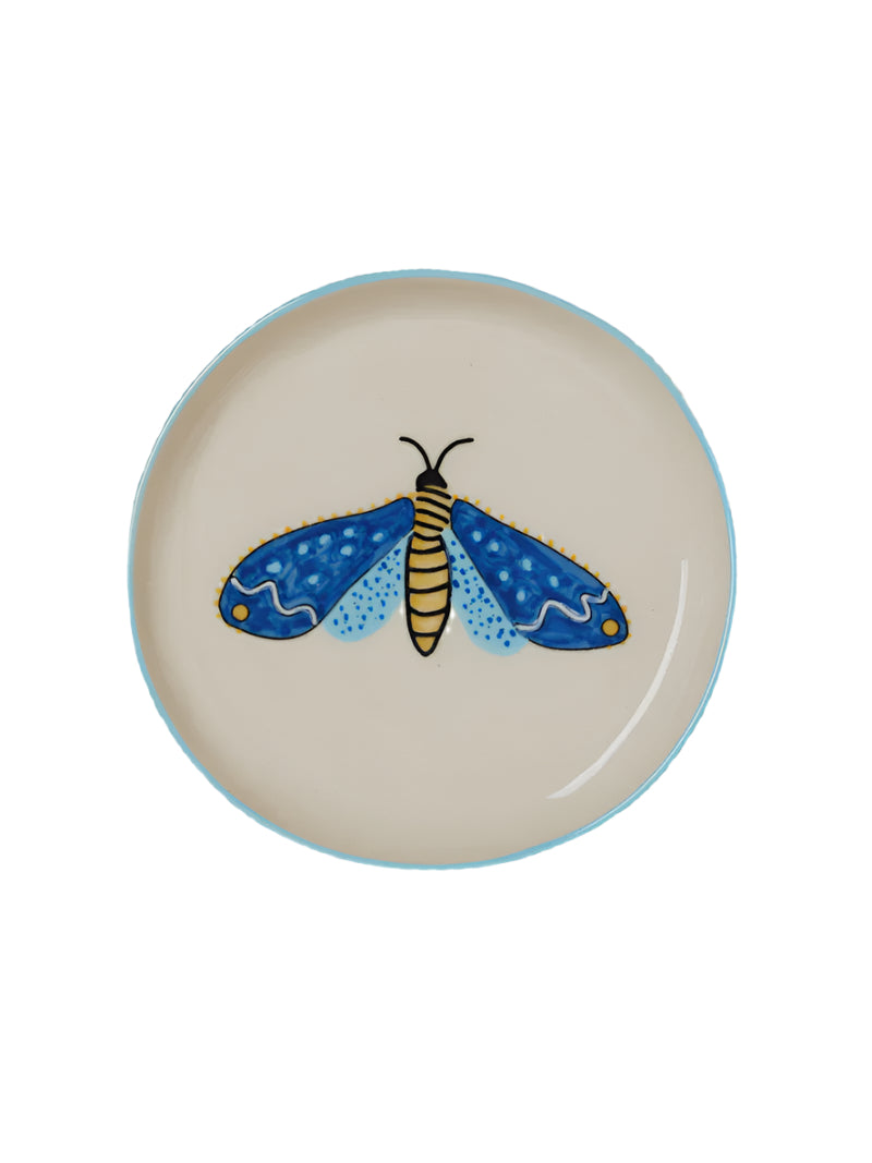 Bring nature's beauty inside with these hand painted ceramic dishes, each adorned with a vibrant, one-of-a-kind moth design hand painted by our skilled artisans. Use the petite decorative plates as charming coasters, for serving small bites, or as trinket dishes. The durable high-fired stoneware features a low-profile shape that tucks easily onto shelves and tables. Mix and match the playful colours for a collected, artisanal look.