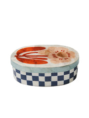 Deep maritime blue checks give this generous Capiz shell box sophisticated presence on vanities and shelves. Designed in Sydney and hand-crafted by skilled artisans, each piece celebrates the natural luminosity of the shell through rich colour, like the fun floral motif top. Perfect for organizing jewellery, mementos, or special treasures while adding a touch of playful colour