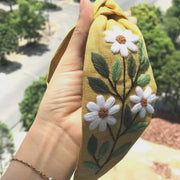Embroidered Linen Turban Knot Headband - Daisy Garden Yellow