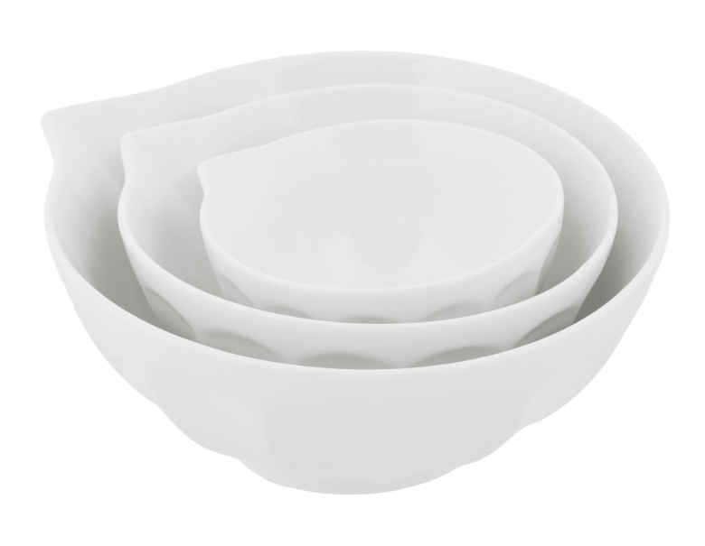 Crafted from porcelain in a beautiful white finish, it includes a full set of small, medium and large mixing bowls.