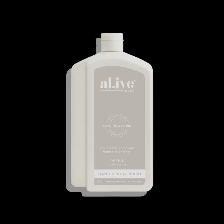 Refill your Sea Cotton & Coconut Wash bottle with our 1 LWash Refill. This sustainable refill solution is designed to reduce waste and offer a practical, eco-friendly way to top up your favourite al.ive body essential.