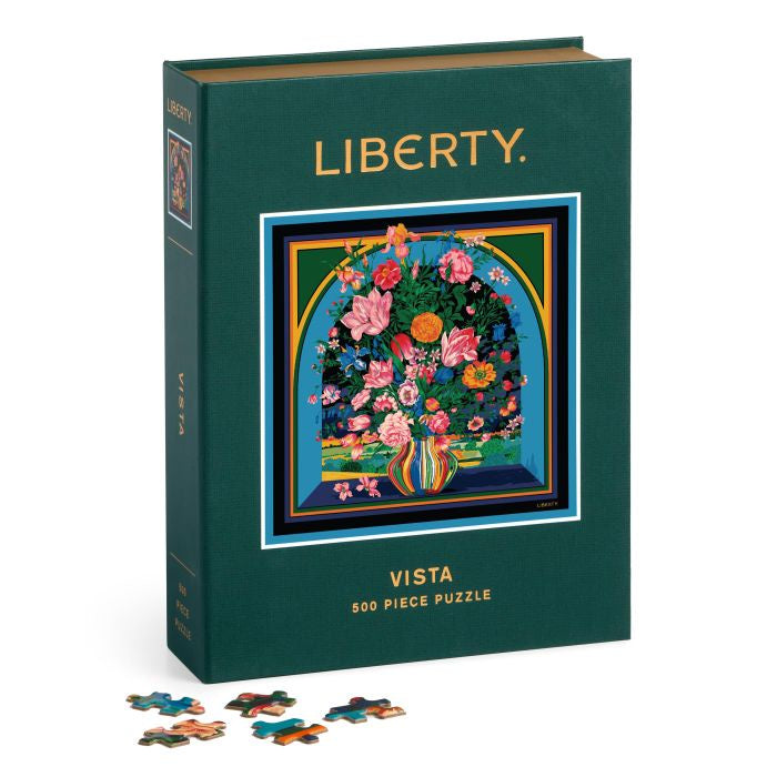 The Liberty Vista 500 Piece Book Puzzle features Liberty’s Vista print, a hand painted scene depicting a view through a window with a floral bouquet at the centre.