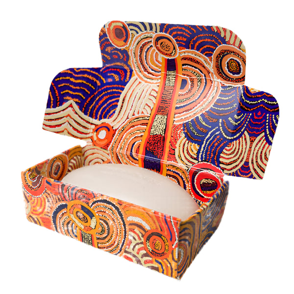 Beautiful Australian Made Soap presented in a gift box featuring artwork by Nora Davidson from Papulankutja Artists in Western Australia.