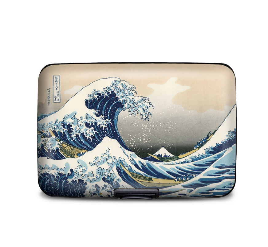 Hokusai Great Wave Armored Wallet is a sturdy aluminum wallet featuring a strong closing clasp and a tear resistant fabric interior accordion that holds up to 6 personal cards. The RFID blocking technology will protect against identity theft.