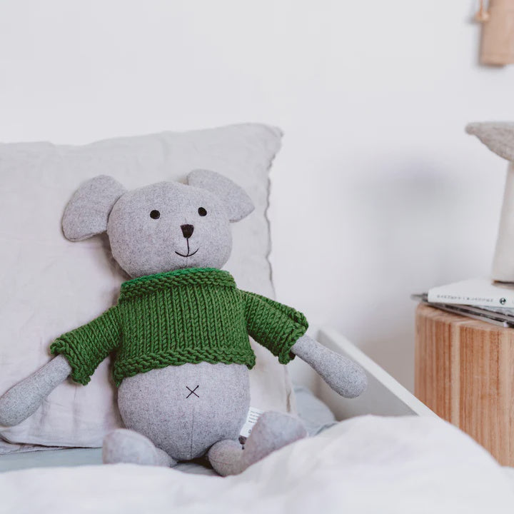 Made with the softest wool blend fabric, Arthur wears a hand knitted emerald green jumper made from Australian Merino wool. A perfect friend who will take pride of place as your child's sleeping companion.