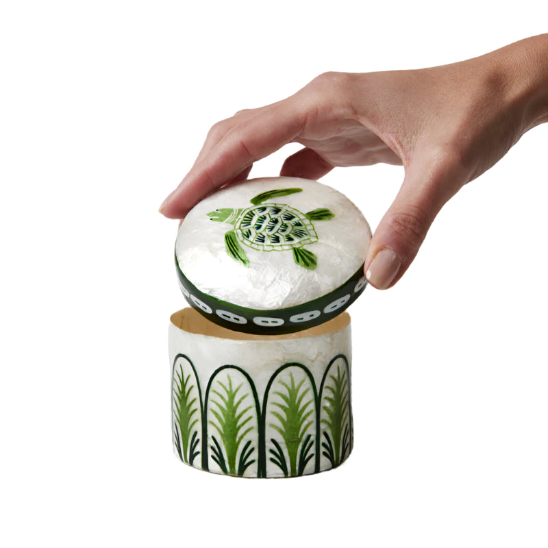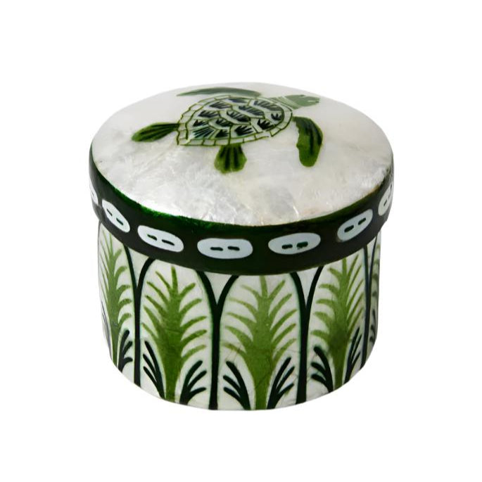 Bring a touch of the sea into your home with the Atlantic Turtle Box. This sweet round box is handcrafted from iridescent capiz shells, giving it a shimmery finish. The lid features an original painting of a green sea turtle, art deco patterns in rich greens dance across the sides, perfect for displaying coastal keepsakes or stashing away small treasures, this one-of-a-kind box adds artisan-made charm and tropical vibes wherever you place it.