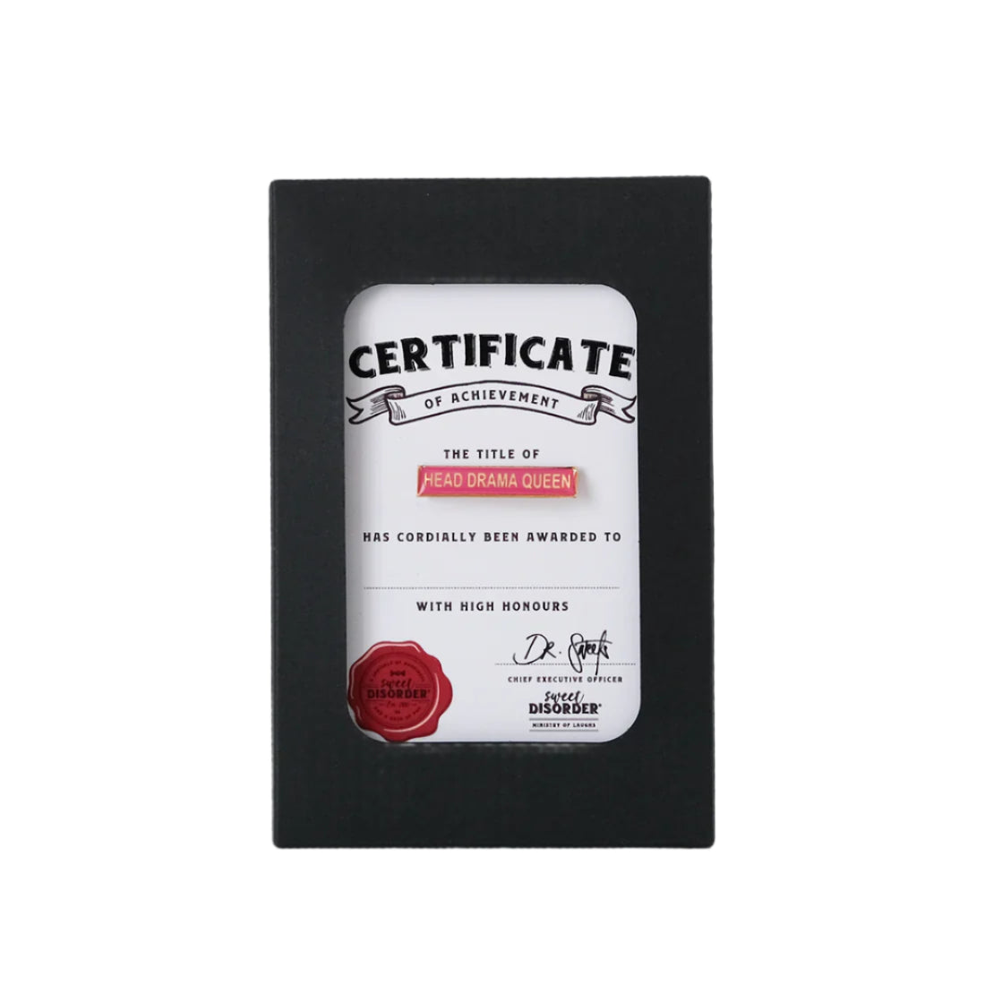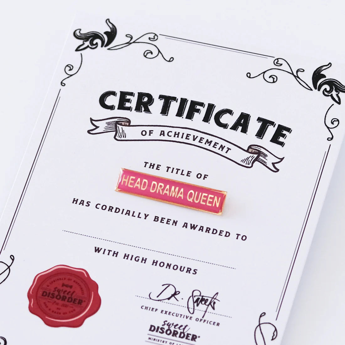 This retro enamel badge and embossed certificate is perfect for someone who excels at turning minor inconveniences into multi-act tragedies. Applause, please.