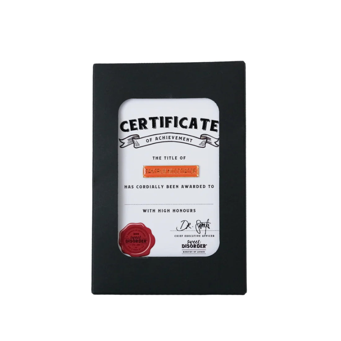 This retro enamel badge and embossed certificate is perfect for the person who excels at defusing drama, bribing with snacks, and calming the chaos (mostly).
