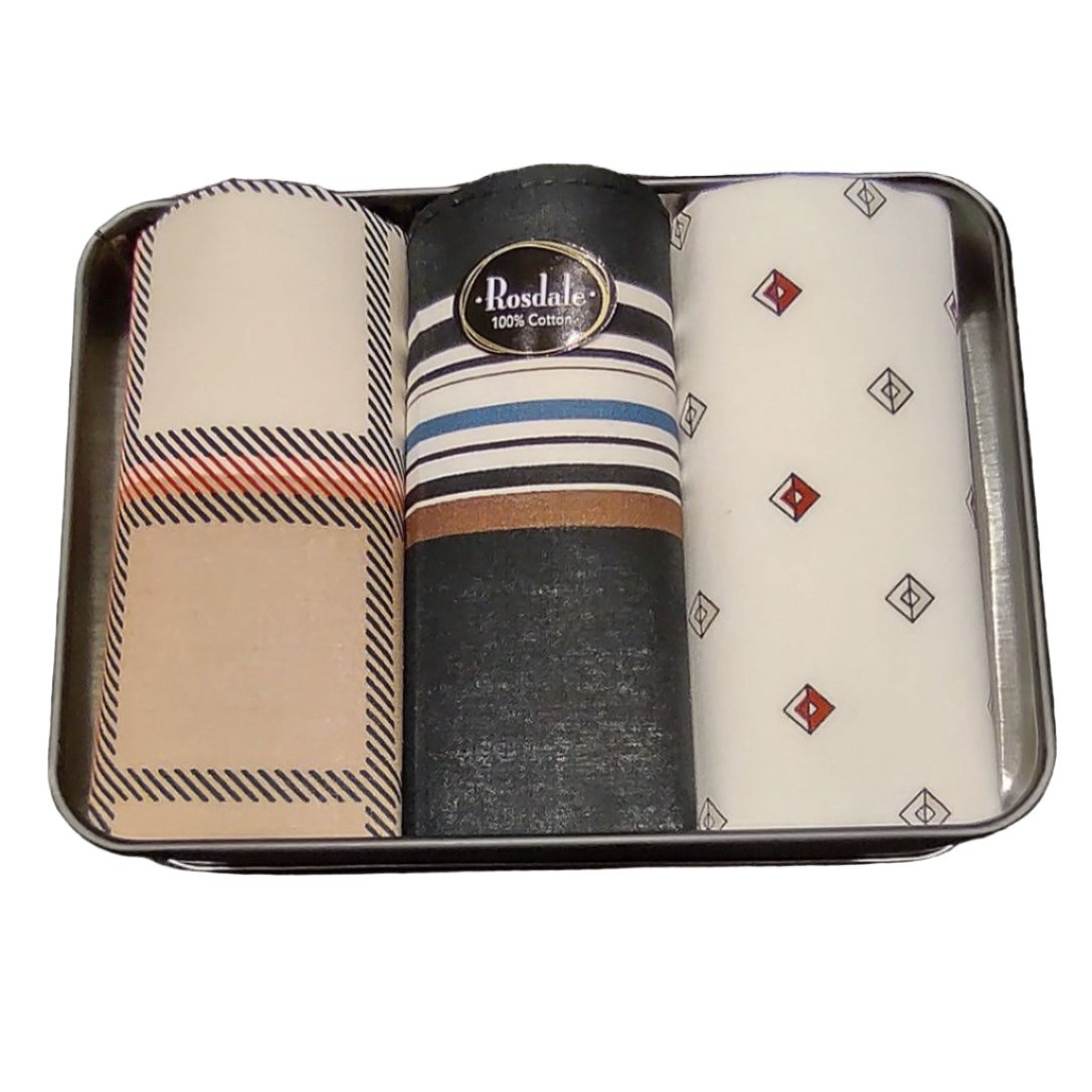 Tin of 3 assorted style printed handkerchiefs with a difference. Makes a great gift pack for any man.