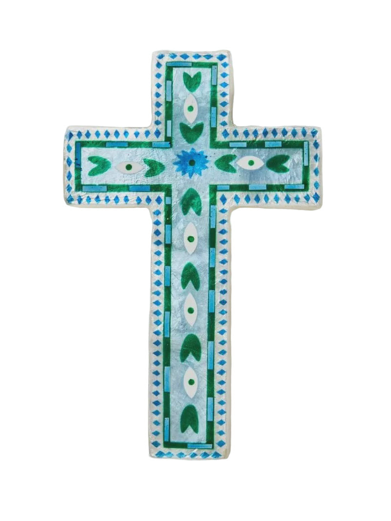 Our Fable Blue Cross merges spiritual symbolism with contemporary craft through luminous Capiz shell and meticulous detailing. This turquoise talisman features geometric patterning and protective eye motifs that create moments of pause in your daily rhythms. Whether displayed alone or arranged in a constellation, this guardian connects your home to traditions of symbolic safekeeping.