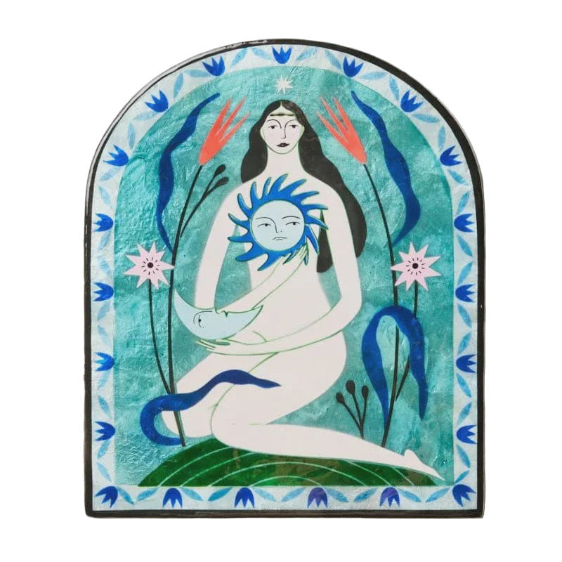 Our Fable Goddess Blue Arch elevates feminine divinity through luminous Capiz shell and evocative folk imagery. This arched talisman depicts a knowing female figure cradling the sun amid flowing waters and botanical abundance. A protective guardian for intimate spaces, it invites moments of narrative pause in daily rhythms while connecting your home to ancient traditions of feminine wisdom and symbolic shelter.