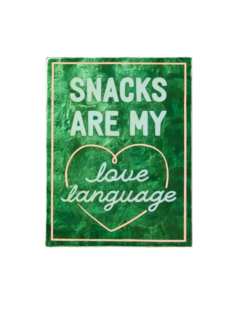Snacks are a love language, and this snack quote tile makes it official. Crafted from glossy capiz shell and painted in rich green with a pretty pink heart, it's a cheeky addition to your kitchen, pantry or snack zone Makes a super fun gift.