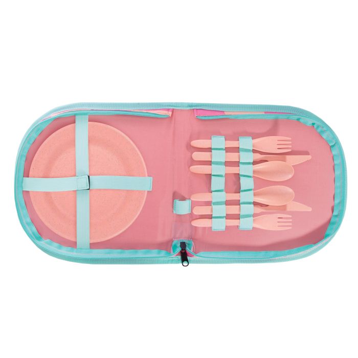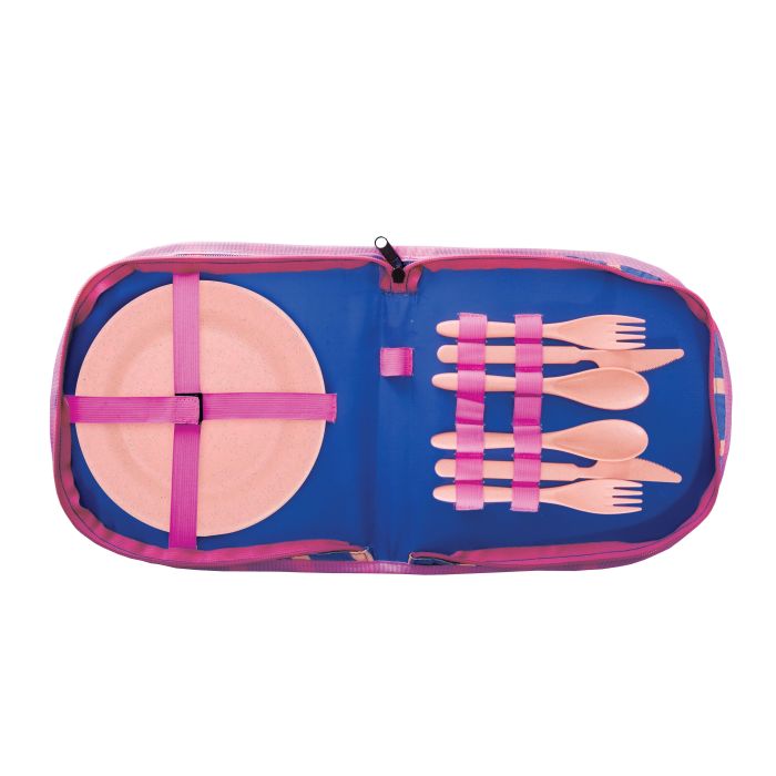 Handy carry case including 2 sets of wheat straw blend cutlery and 2 wheat straw blend plates.
