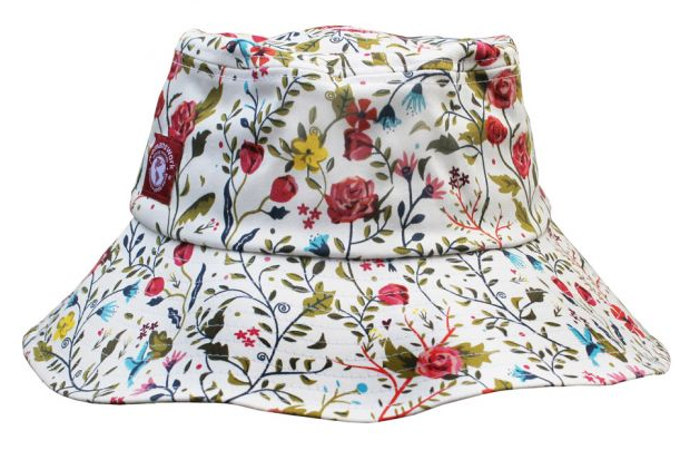 Wide-brimmed cotton bucket sun hat with an exclusive Garden of Paradise print. A tie on inside of hat adjusts the fit to any head size. Fully lined. Womanswork Hats block more than 95% of UVA & UVB rays.