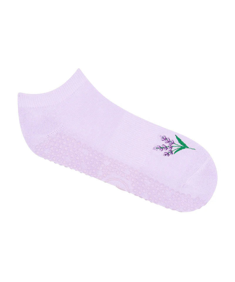 Gift box includes the Classic Low Rise Grip Socks in 'Strawberry Patch', 'Sunflower Fields' and 'Lavender Haze', styles in size Medium.