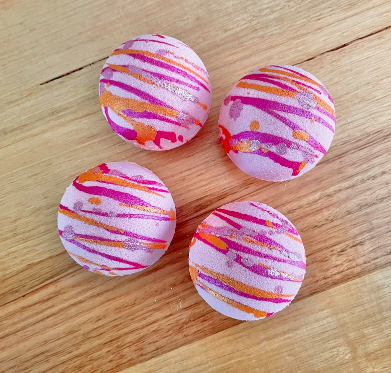 A stunning bath bomb with notes of white florals, peach, guava, mango, and papaya.