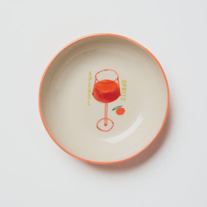 Zesty and fresh with a twist of orange. This Aperol spritz cocktail bowl is hand-painted with a bright citrus rim and a stylised spritz illustration in the centre. Stack them high and serve with joy.