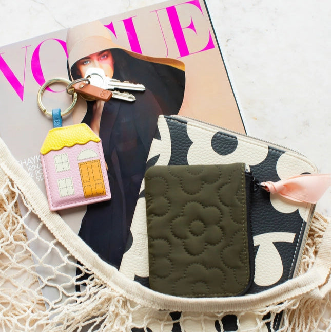 This mini coin purse in a quilted floral khaki exterior is the ultra-compact size which fits seamlessly in your pocket or handbag. This practical purse is finished with a striped lining, internal pockets and contrast zip and grosgrain pull.
