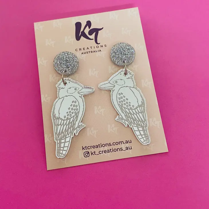 Stunning Kookaburra dangles. 15mm silver glitter topper & 45mm mirror silver dangle. Stud backing made from surgical steel, perfect for sensitive ears. Acrylic earrings are lightweight to wear and the perfect accessory to every outfit. Handmade in Brisbane.
