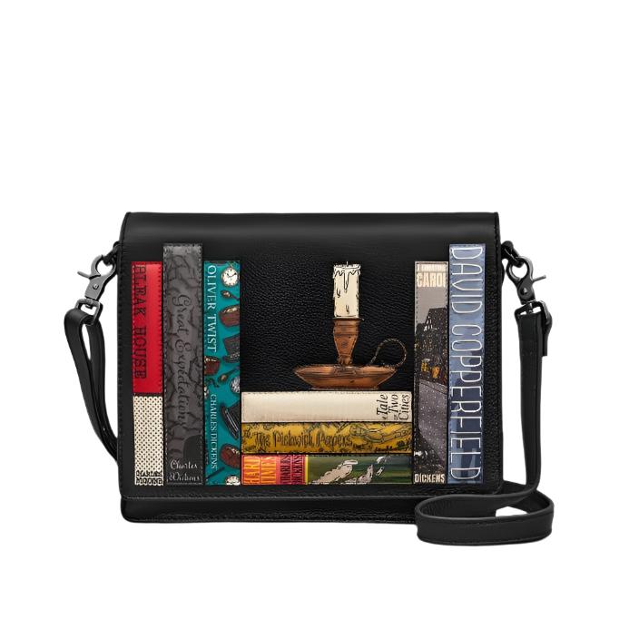 Charles Dickens is a literary genius and widely regarded as the greatest novelist of the Victorian era. Here we pay tribute with this leather grab bag featuring his most loved works. Each of the famous book titles have been hand drawn to capture the tone and themes that are contained within the novels. From the industrialist ideas of Hard Times to the enchanting and slightly spooky a Christmas Carol, these novels pop on the front of the bag. This across body bag for women can also be worn over the shoulder and has a triple gusset construction inside.