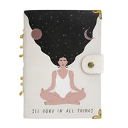 Embrace positivity with the Leather N/Book See Good, a uniquely designed notebook that carries an inspirational message "See Good in All Things". This compact 18x13cm journal features a chic black and cream colour scheme with an elegant leather cover and high-quality paper pages, perfect for writing, journaling, or sketching. The eye-catching design and motivational appeal make it an attractive product for customers seeking both style and substance in their stationery collection.
