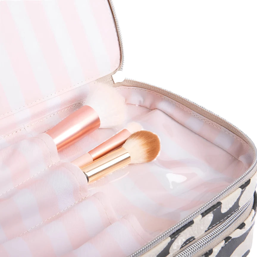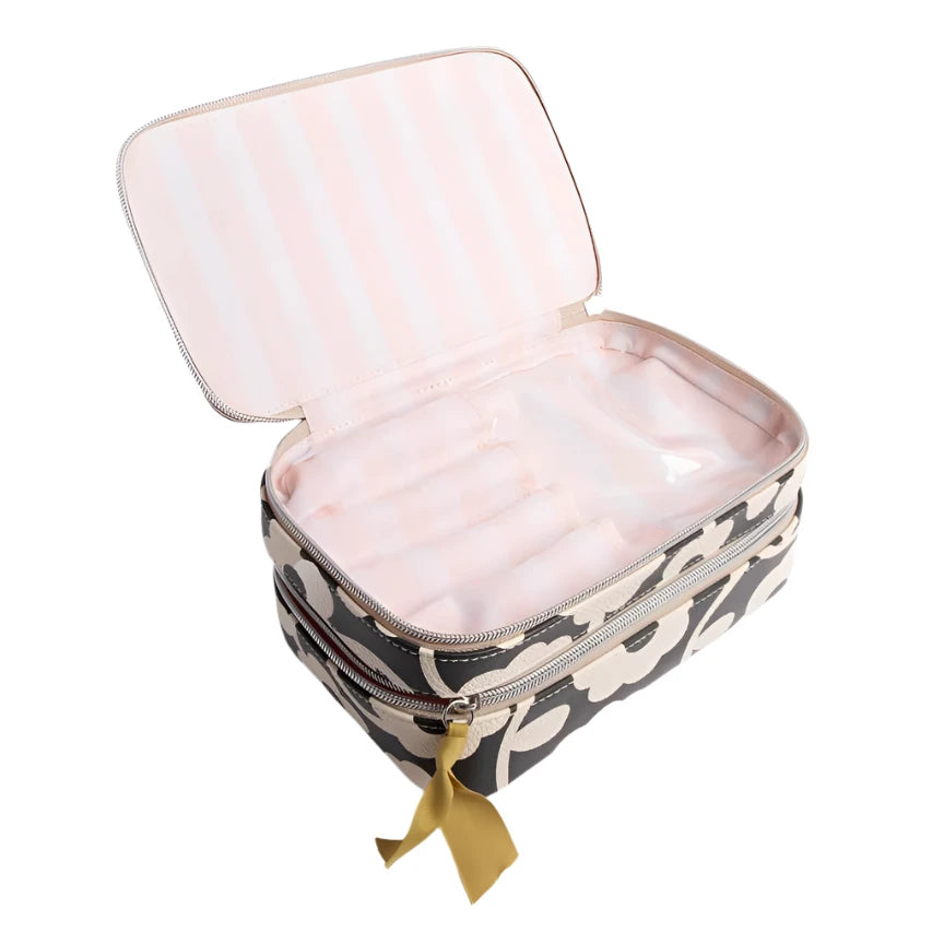 New for this season - a make up organiser in our bestselling mono flower print! Featuring two roomy sections to store all your essentials and brush dividers to keep tools organized. Wipe-clean lining for easy cleaning.