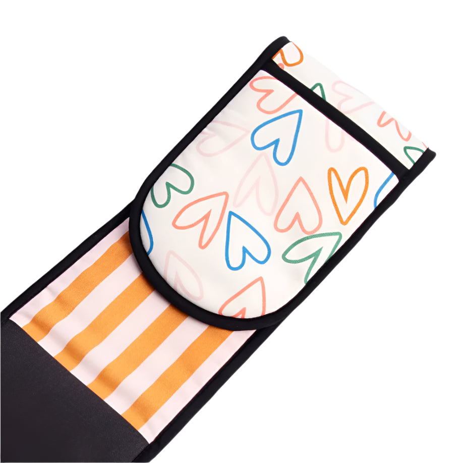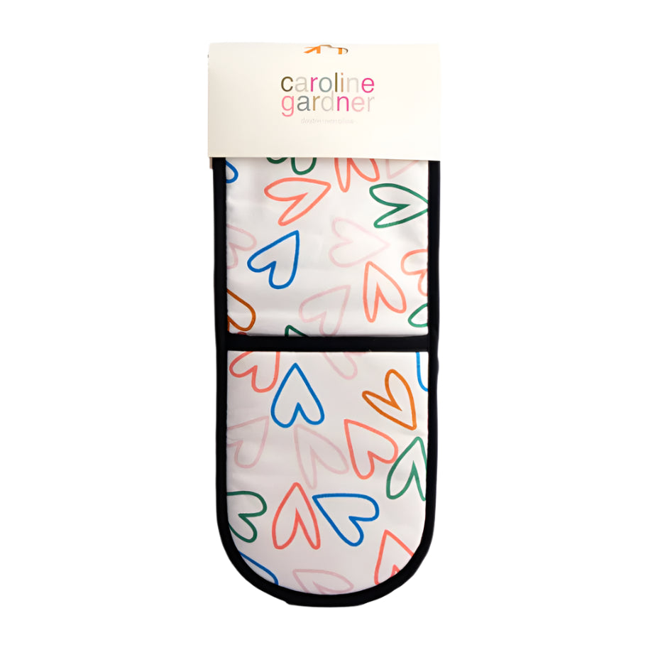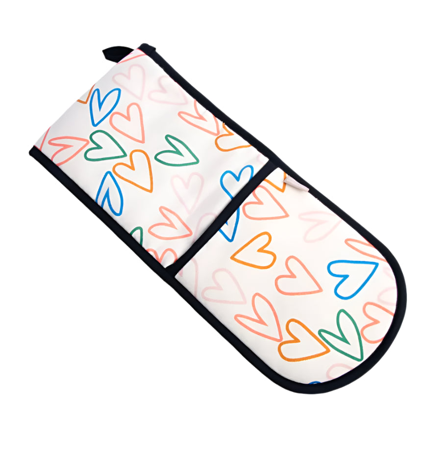 Freshen up your kitchen with our new hand-printed oven gloves. Made from 100% cotton, featuring our new multi hearts design. Internal silicone pads on each hand offer extra heat protection.