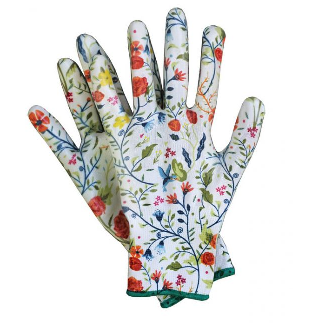 These form fitting gloves are dipped in clear nitrile on palms and fingertips for a waterproof coating. The back of the glove is uncoated and breathable so you can work in comfort. Great finger feel for pulling out small items such as weeds! Tough and stylish, featuring our exclusive Garden of Paradise print. Machine washable.