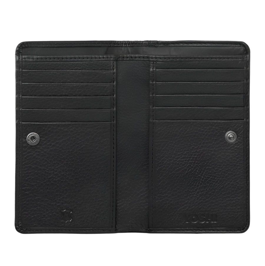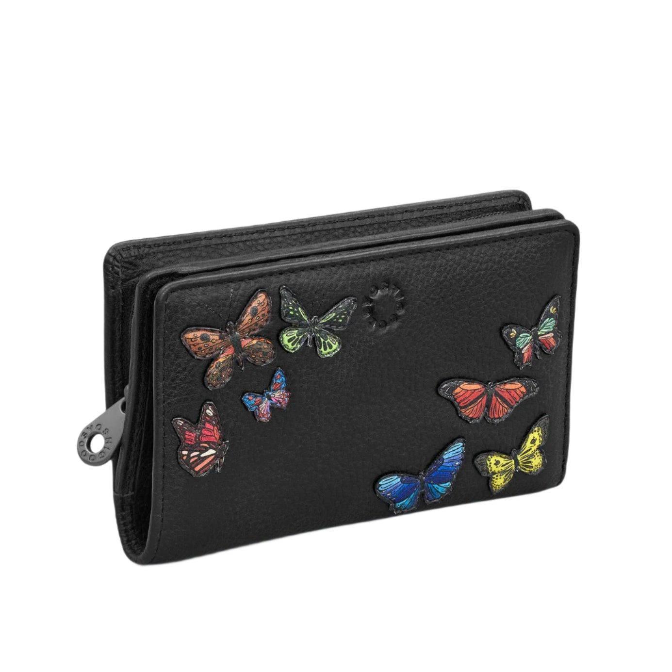 A delicate scattering of butterflies in flight adorn the front of this soft black leather flap over purse and there is plenty of room for cards, cash and coins.