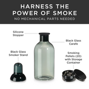 - Included: 1 Glass Smoking Stand, 1 Glass Infuser Carafe, 1 Silicone Stopper, 20 Smoking Pellets, 1 Recipe Booklet