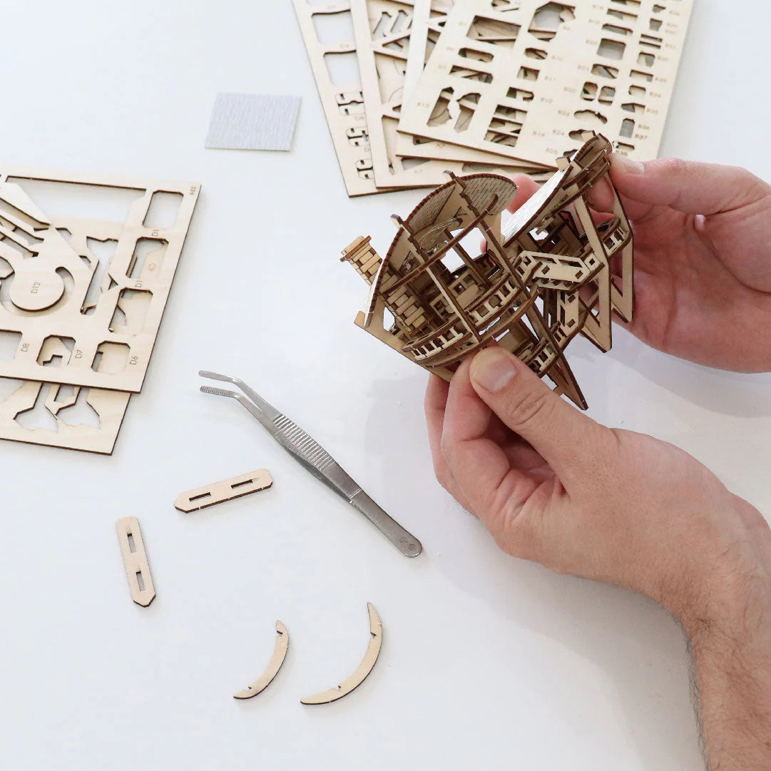 DIY wooden model kit with easy to follow instructions. Includes LED lights, acrylic stake (moisture resistant) and assembly tools.