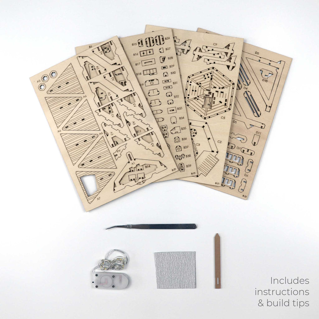 DIY wooden model kit with easy to follow instructions. Includes LED lights, acrylic stake (moisture resistant) and assembly tools.