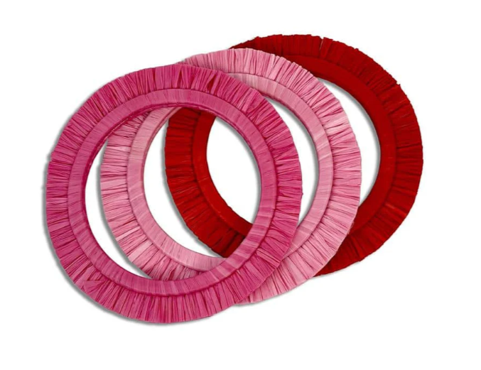 Discover the Trio Encandado Bangles, a vibrant set of three raffia bangles in pale pink, hot pink, and red, inspired by the lively spirit of South America. Perfect for adding a touch of natural elegance and colorful flair to any outfit.