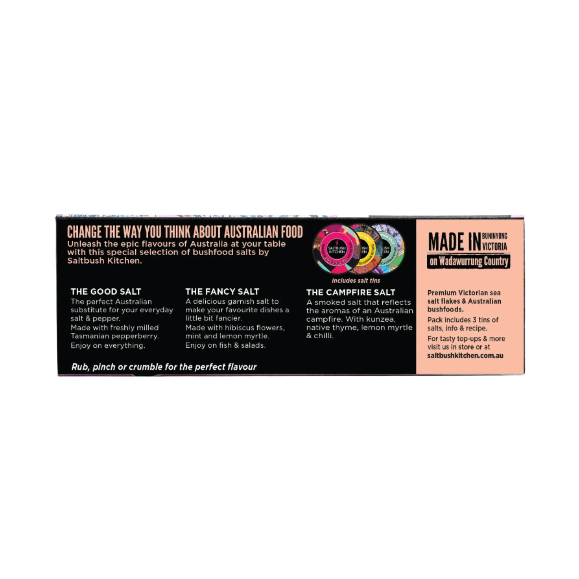 - 3 x 18g tins of Saltbush Kitchen's signature salt range including The Good Salt, The Fancy Salt & The Campfire Salt