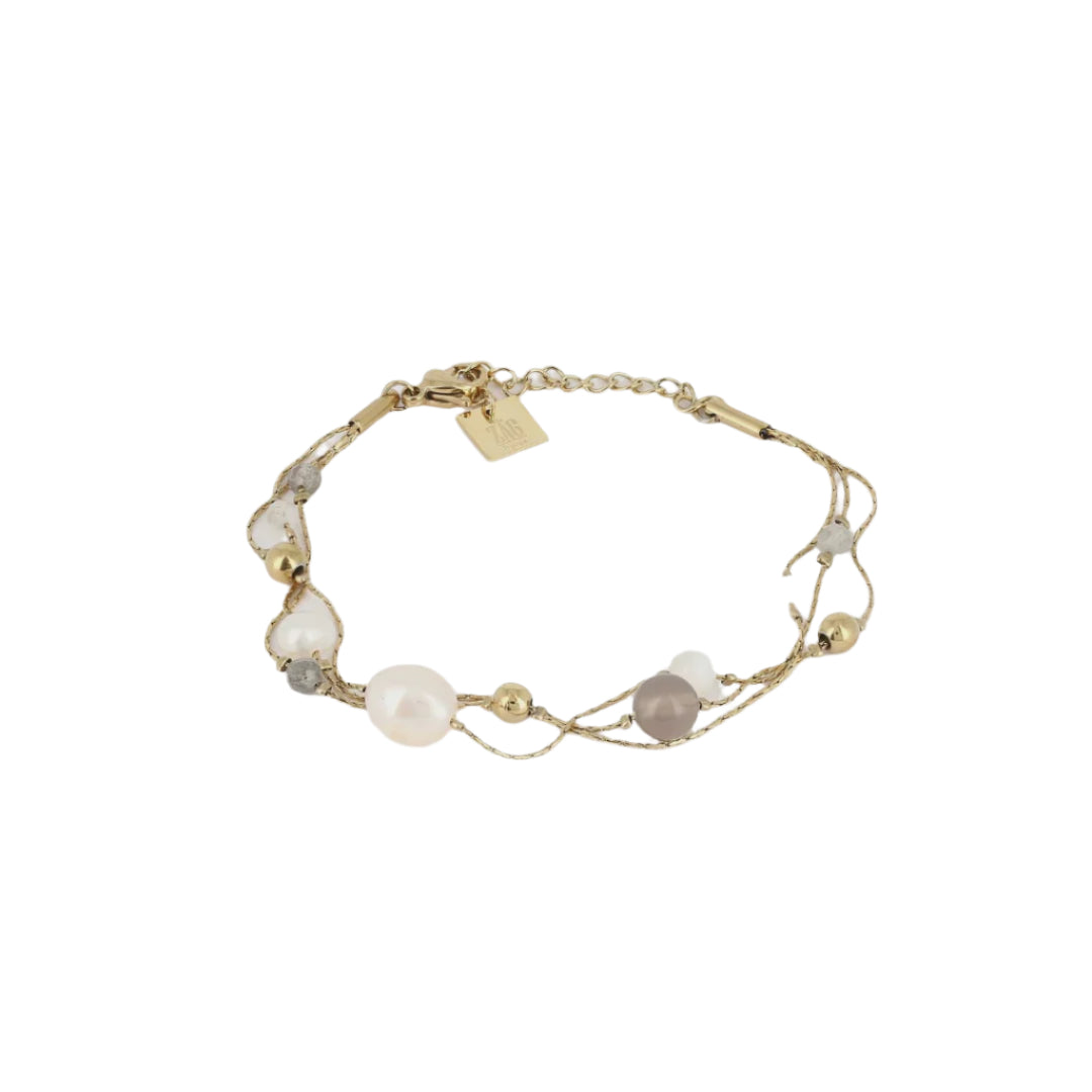 A stunning multi-stranded bracelet made of stainless steel and decorated with gold balls and semi-precious stones of various sizes.