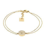 A double stranded bracelet made of steel and coated with gold. The chain loops around a solid circle encrusted with zirconiums with a small central gold ball.