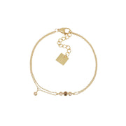 A double stranded bracelet made of stainless steel coated in gold. The bracelet is decorated with a small bar with a tiger's eye in a cabochon setting highlighted with two small crystals.