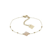 A rosary style bracelet and our best seller. A fine chain is decorated with small gold balls to add style and texture. A semi-precious Sunstone is faceted in the shape of a clover.